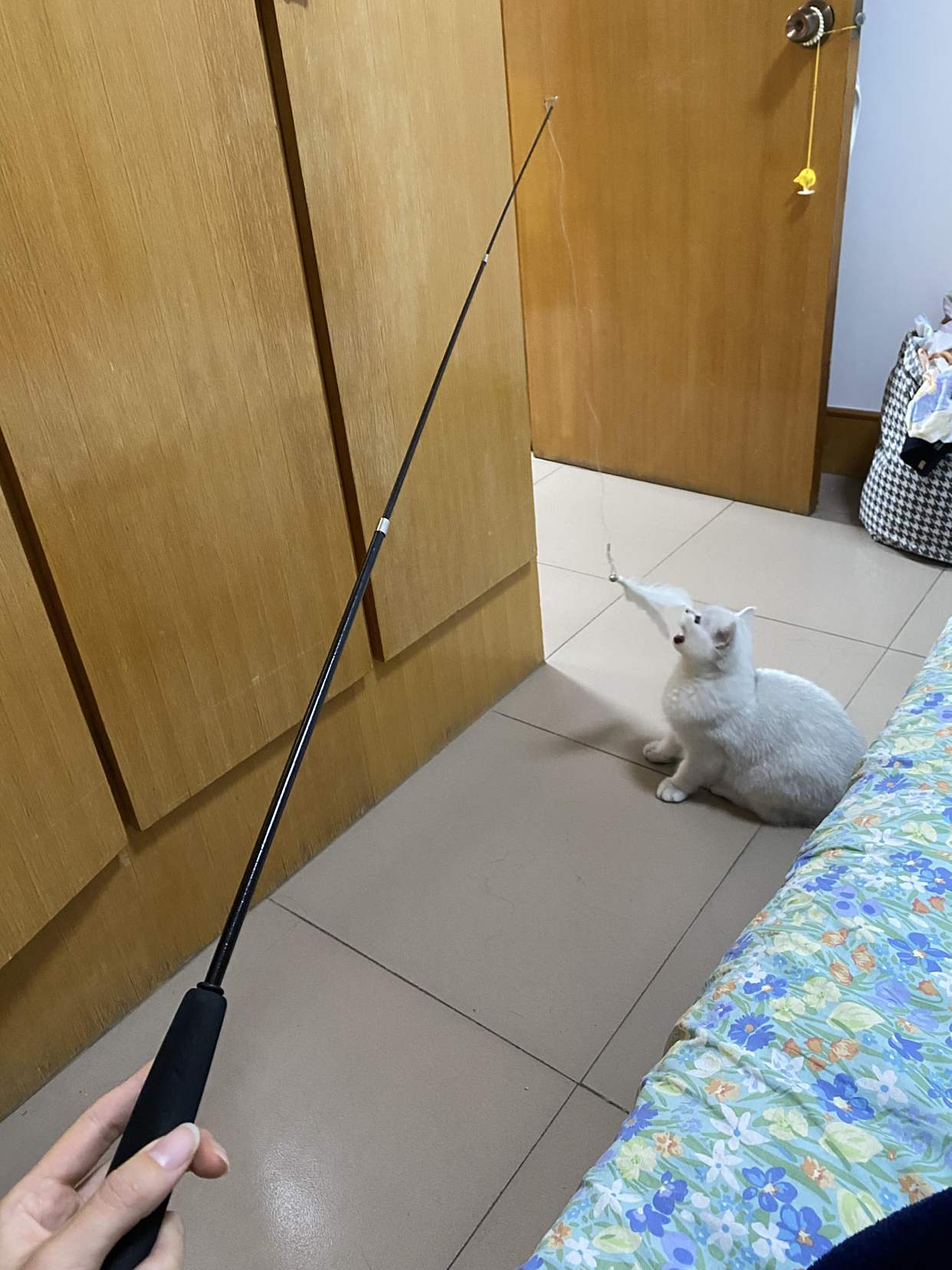 逗猫棒是玻璃纤维的,要是用久了杆子折了,玻璃纤维满天飞。即使没折断也会有风险,手握在杆上往回收时,可能就会被扎一手的刺。