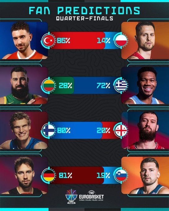 欧锦赛官方发布1/4决赛球迷预测结果,具体如下:土耳其86% 波兰14%立陶宛28% 希腊72%芬兰80% 格鲁吉亚20%德国81% 斯洛文尼亚19%...