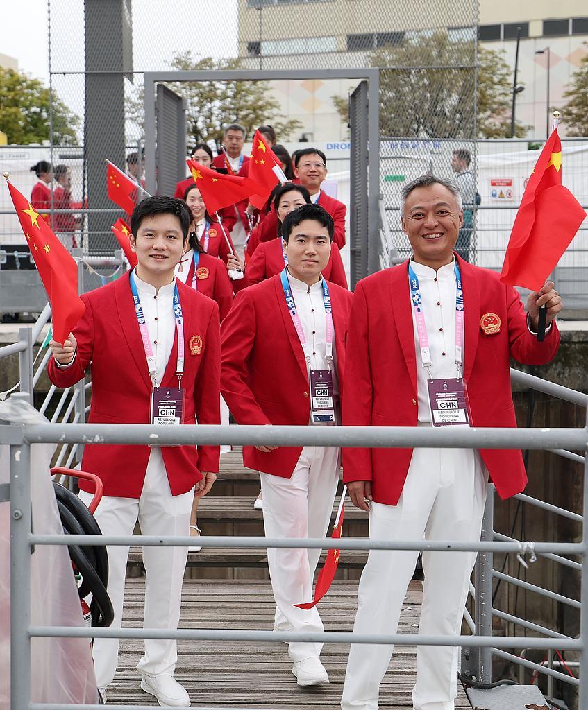 当地时间2024年7月26日,巴黎奥运会开幕式,中国代表团准备入场。前排为樊振东、梁靖崑与秦志戬。