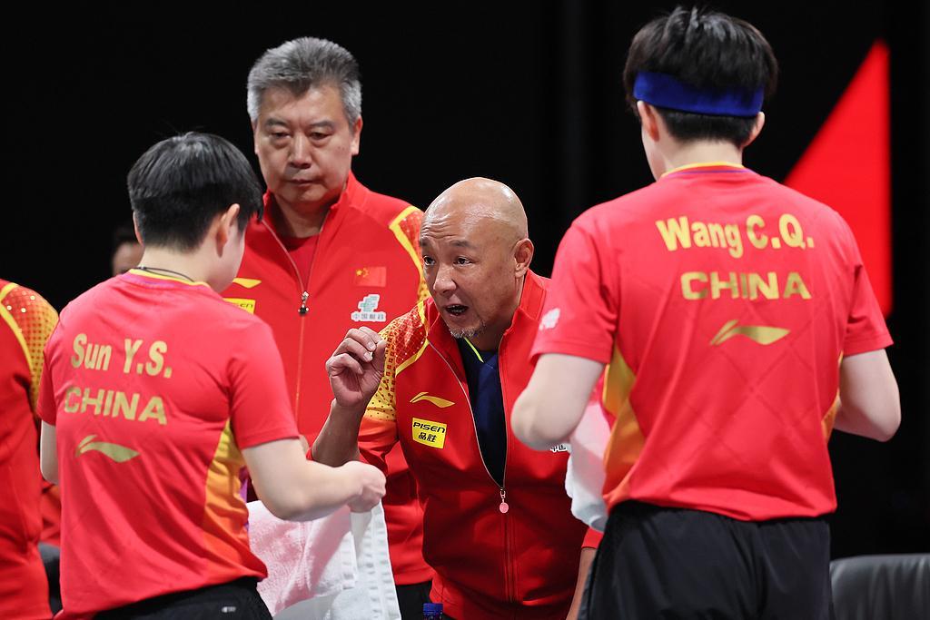 2024年12月6日,2024成都国际乒联混合团体世界杯第二阶段循环赛,中国队8比2战胜日本队。图为肖战正在指导孙颖莎与王楚钦。